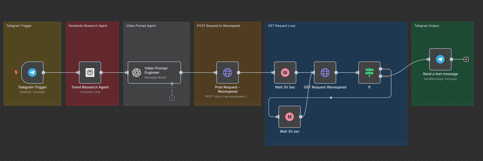 Solution: We developed an AI agent that monitors Telegram trends, converts insights into prompts, and automatically generates videos using Wavespeed.